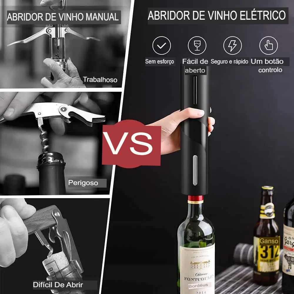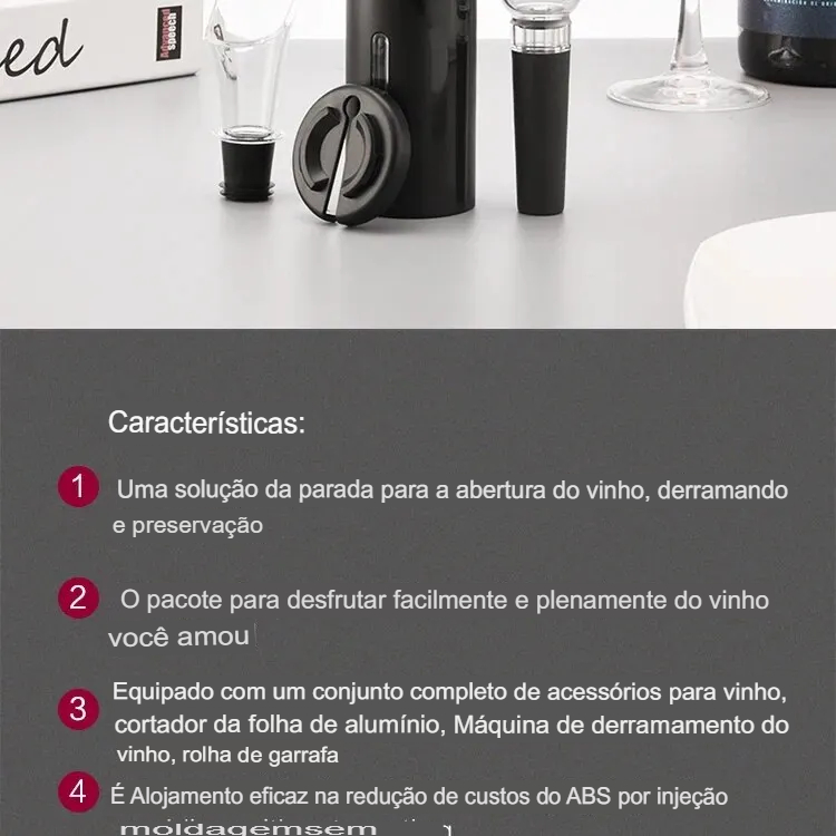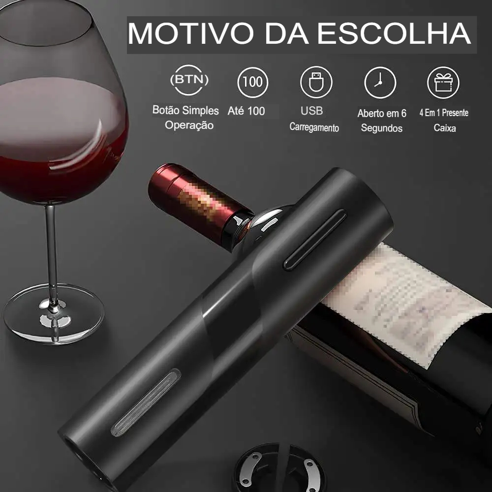 • Abridor elétrico do vinho:Este abridor de vinho tinto elétrico é um acessório de cozinha obrigatório, perfeito para abrir sem esforço suas garrafas favoritas de vinho tinto. Seu mecanismo automático do saca-rolhas assegura a preparação fácil e eficiente do vinho.
